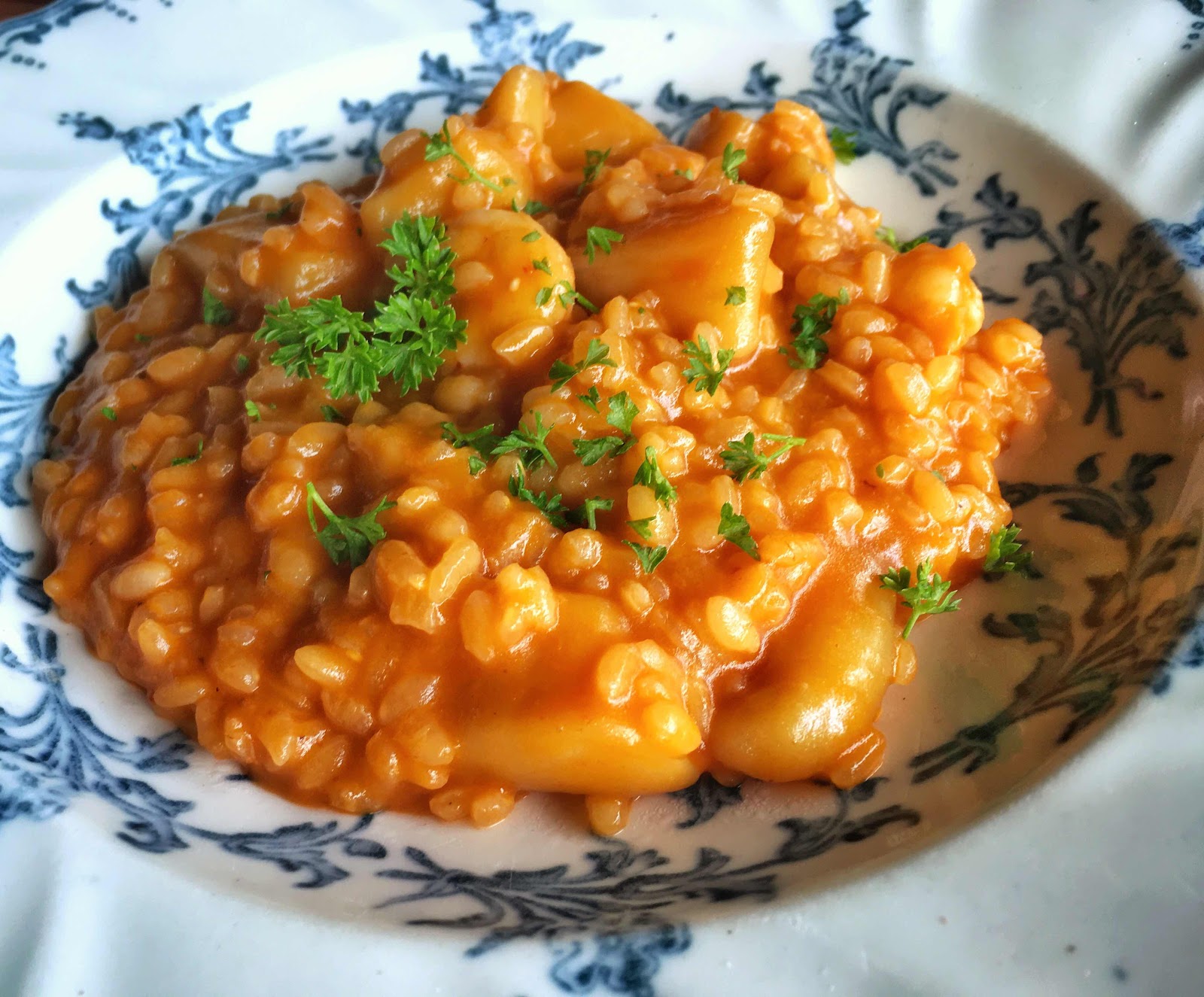 8 agrega las colas de las gambas y programa 2’ 100° V 1 giro a la izquierda , vierte en una fuente y tapa para que repose 5’ mientras pica perejil fresco y espolvorea por encima antes de servir, ha de quedar cremoso y meloso, ni seco, ni caldoso.