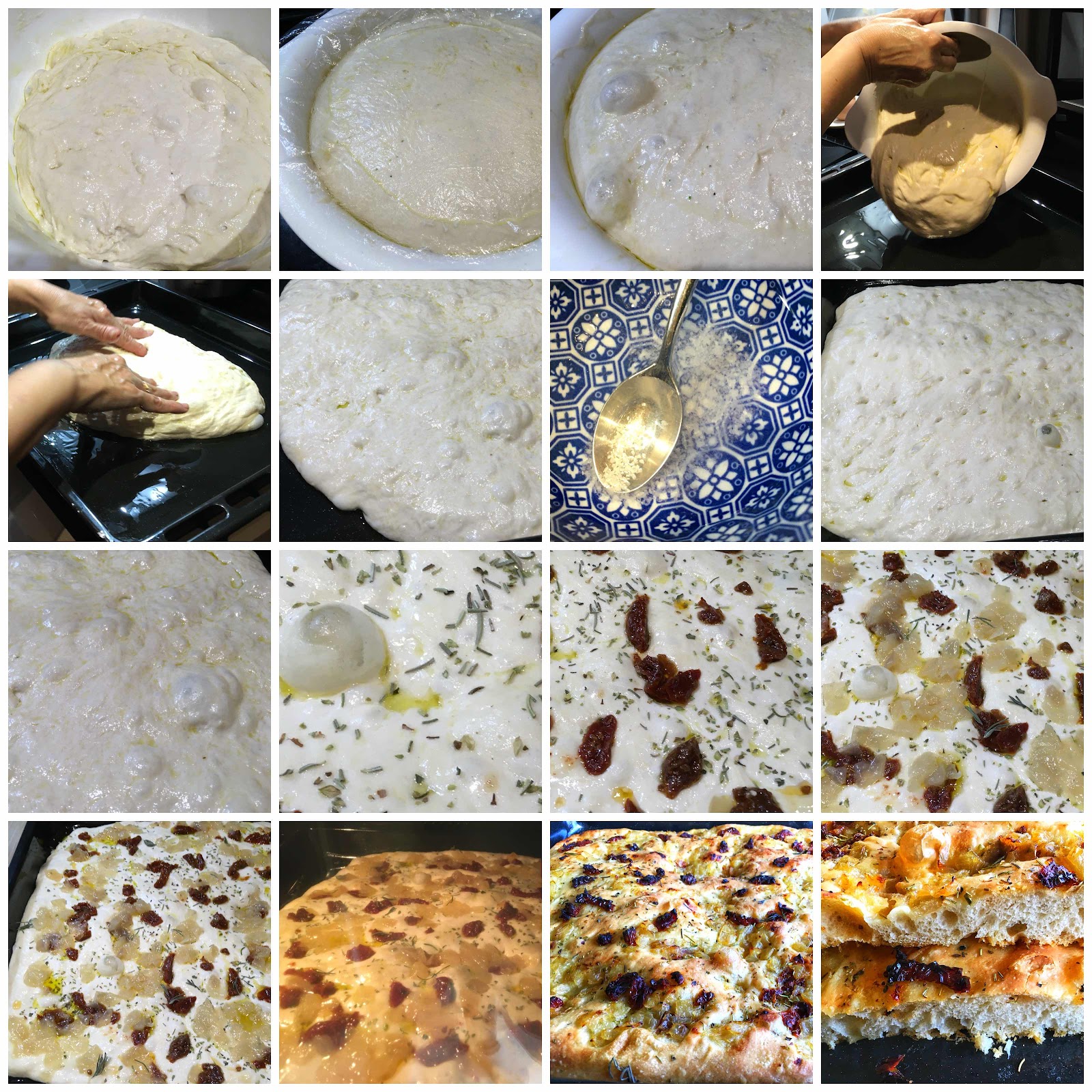 Pasado el reposo, volvemos a hundir los dedos sobre la masa y añadimos la salmuera que se colará por ellos, dejamos que se absorba 30 minutos y a continuación repartimos por encima las hojas de romero, los tomates secos troceados, esparcimos orégano y por último la cebolla frita y escurrida, y encendemos ya el horno para que esté bien caliente a 220°, con calor arriba y abajo la horneamos 25-30 minutos o hasta que esté dorada, sacamos y dejamos enfriar bien y después la cortamos en tiras para servirla y a disfrutarla ! Nuestra focaccia deberá quedar crujiente por fuera y muy tierna y esponjosa por dentro