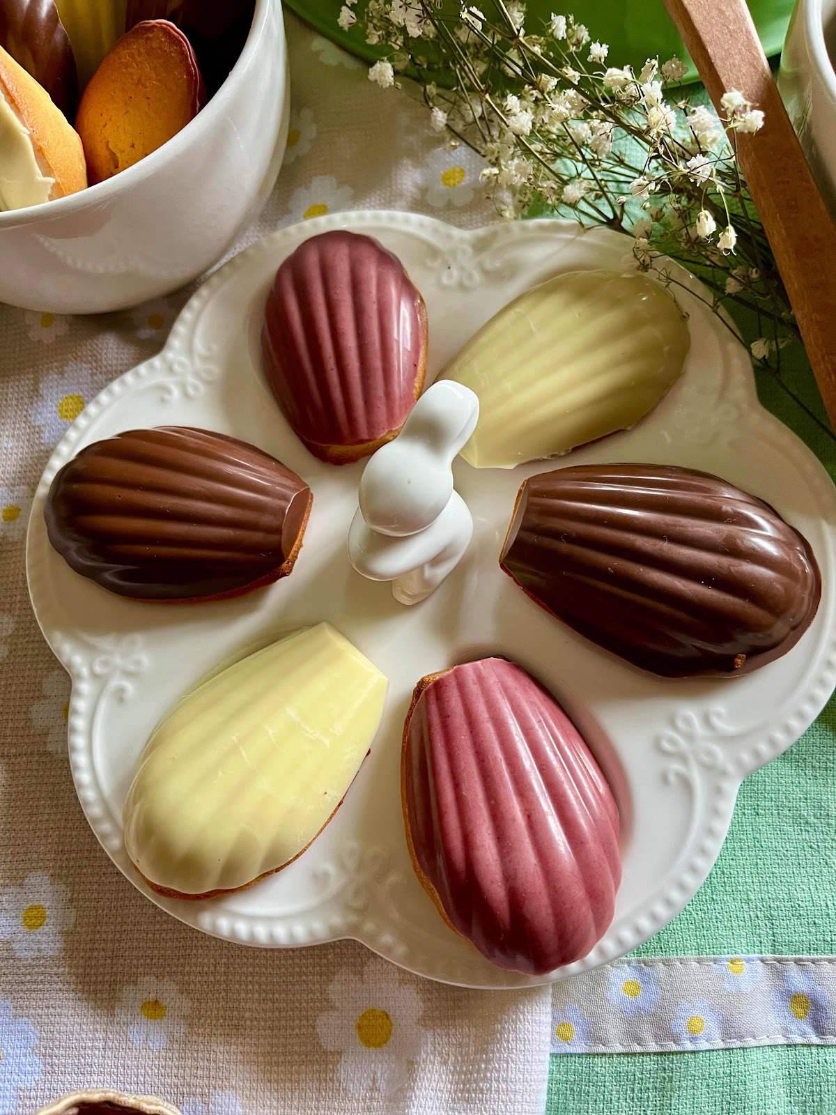 Habremos limpiado muy bien el molde, y bien seco lo colocáis sobre una bandeja, distribuimos en cada cavidad como una cucharada de chocolate, rellena una fila, sacude un poco y recoloca encima una madeleine, haciendo un poco de presión para que se expanda el chocolate y forme la concha, continua con toda la fila, funde el siguiente chocolate y repite así, hasta rellenar todas las cavidades, una vez completadas, dejamos enfriar en la nevera unos minutos para que cristalice el chocolate, y poder desmoldarlo, en unos 15 minutos lo tendréis, desmoldamos y servimos nuestras madeleines como más nos guste, yo os dejo esta idea de presentación, pero realmente son tan bonitas que quedan preciosas en cualquier recipiente, y además de bonitas, son un bocado muy rico y con el chocolate más atractivas aún .